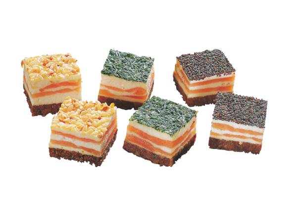 Würfel 2,3 cm Kantenlänge bestehend aus einer Lage dunkelbraunem Pumpernickel, drei Lagen cremeweißer Frischkäsecreme und zwei Lagen rosafarbenem Lachsfilet. Bestreut mit Dill, Sesam oder Mohn.